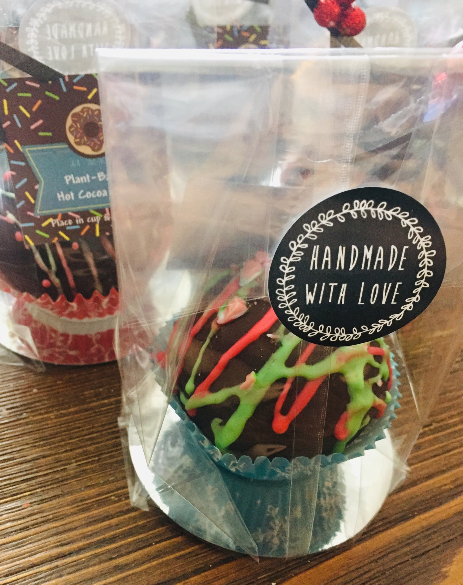 Vegan Candy Cane: Vegan Chocolate, raw cocoa power, organic cane sugar, crushed vegan candy canes & powdered sugar, vegan & dye-free food colorant.